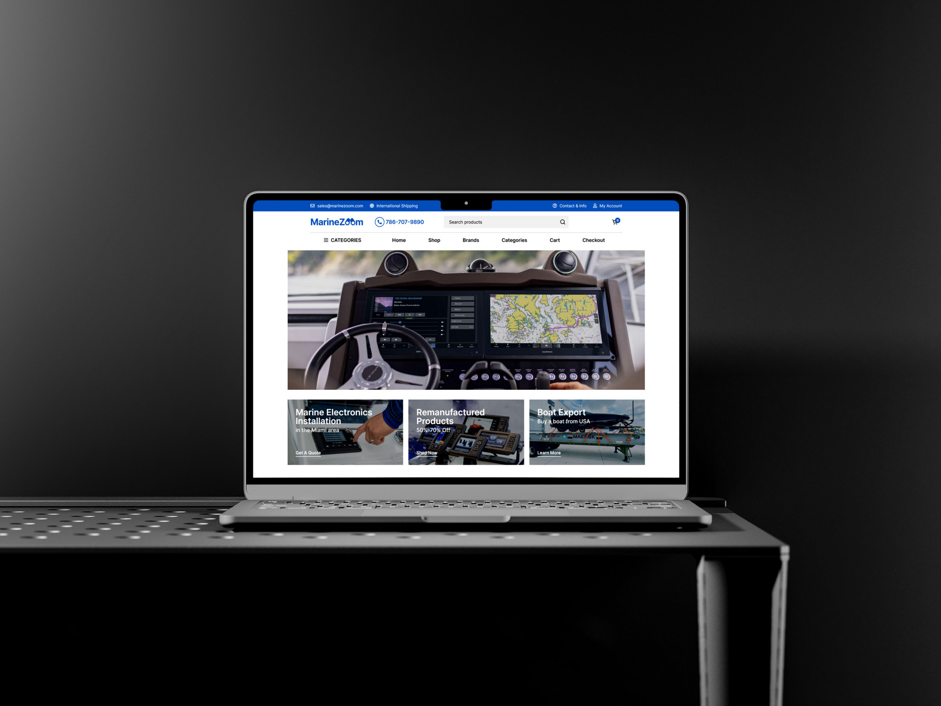 The business specializes in marine electronics installation, offering a wide range of products such as radars, GPSMAP, chartplotters, transducers, and more from various brands including BG, BlackOakLED, Garmin, Furuno, and others.